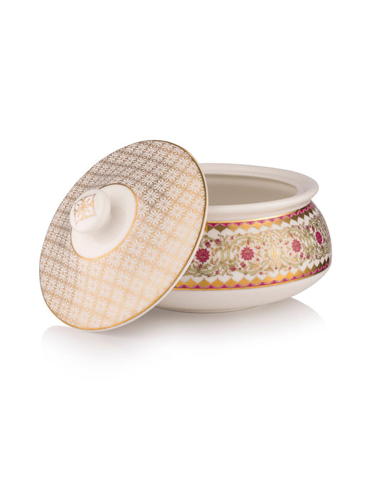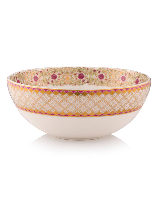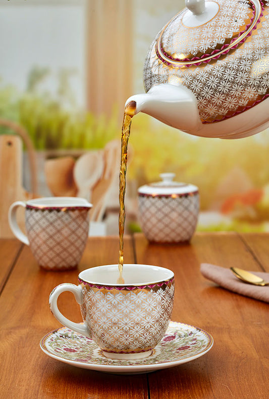 Add a touch of elegance to your dining table with the Nur Collection from Naqsh Living. Featuring exquisite gold plating and delicate floral patterns with green stems, this collection brings timeless charm and sophistication to your special occasions.